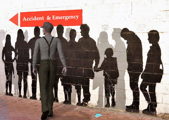Home to what seemed a potentially serious medical problem. I filled in the Surgeries obligatory online form. Its drop down menu was useless and I typed in the symptoms. Bizarrely, the last question was "What would you like us to do?" Later I was an given anointment to see a GP the next day. After an examination he said, "You must go to the hospital now". He phoned them and gave me a letter to the Surgical Admissions Department. "Go to A&E and they'll pick you up from there". I joined a queue snaking its way outside the building. Finally, I reached the entrance and was waived in. A man at a desk looked at my letter. Copied some of it by hand onto a form and asked me how to spell "Wood". Now with the Surgery letter and his form I entered A&E and joined another queue. At last I reached a cubicle and a window manned by one of two ladies. After confirming name address and so on, I was told to make my way to the surgical department. From observation 90% of those in A,&E were suffering from not being able see a GP.