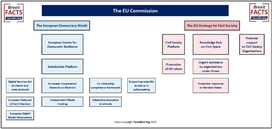The term 'European Democracy Shield' embraces one major element: the 'European Centre for Democratic Resilience ', under which is another body called the 'Stakeholder Platform', which in turn has a sub-stratum of three main components beneath it which contain various other new and existing bodies.
